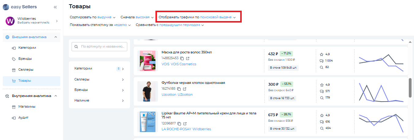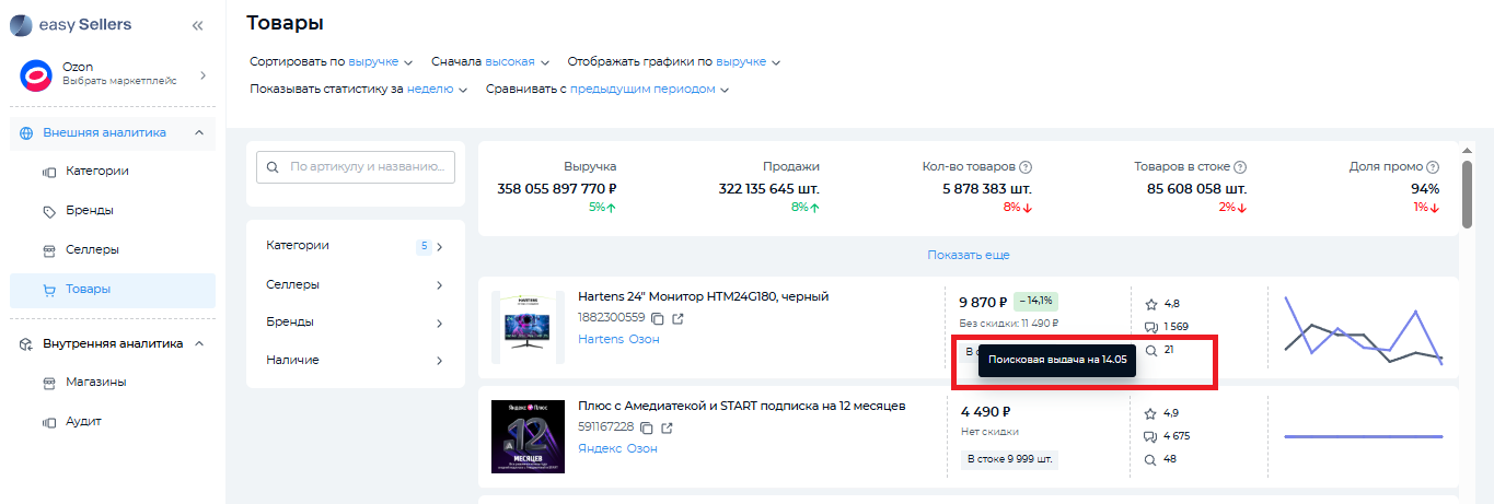 какие товары лидируют в выдаче по категории, у конкретных селлеров или у выбранных брендов;