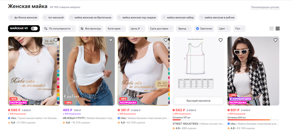 В новой карточке ключевые слова аккуратно интегрируют в заголовок и описание товара, а также добавляют релевантный контент: фото, видео, полезную инфографику, рич-контент (мини-лендинг, презентацию). Если выпустить на площадку карточку без предварительной оптимизации, она утонет на дне выдачи и не попадется на глаза покупателю.