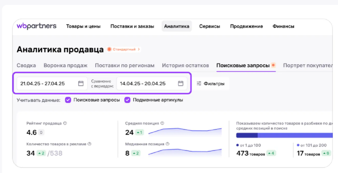 Для SEO-оптимизации старых и новых артикулов необходимо собрать запросы, по которым товары на маркетплейсах ищут пользователи. Сделать это можно в личном кабинете селлера на площадке и с помощью сервиса внешней аналитики.