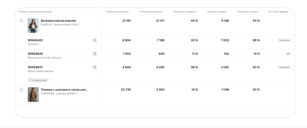 Помимо внутренних отчетов для SEO-оптимизации карточек, Вайлдберриз предлагает продавцам интересный инструмент для оценки эффективности каналов маркетинга — сервис подмены артикула. Для разных каналов продвижения селлер создает подменный артикул на определенный товар. Обособленное отслеживание трафика по каждому каналу помогает понять, откуда покупателей приходит больше. По итогам использования сервиса подмены артикула можно выбрать наиболее эффективный канал продвижения и сократить затраты на рекламу, исключая слив бюджета на провальные кампании.