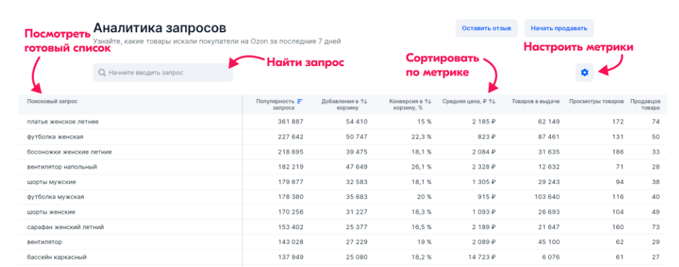 Данные о запросах хранятся в разделе личного кабинета селлера «Что продавать на Ozon». С помощью информации из отчетов можно: