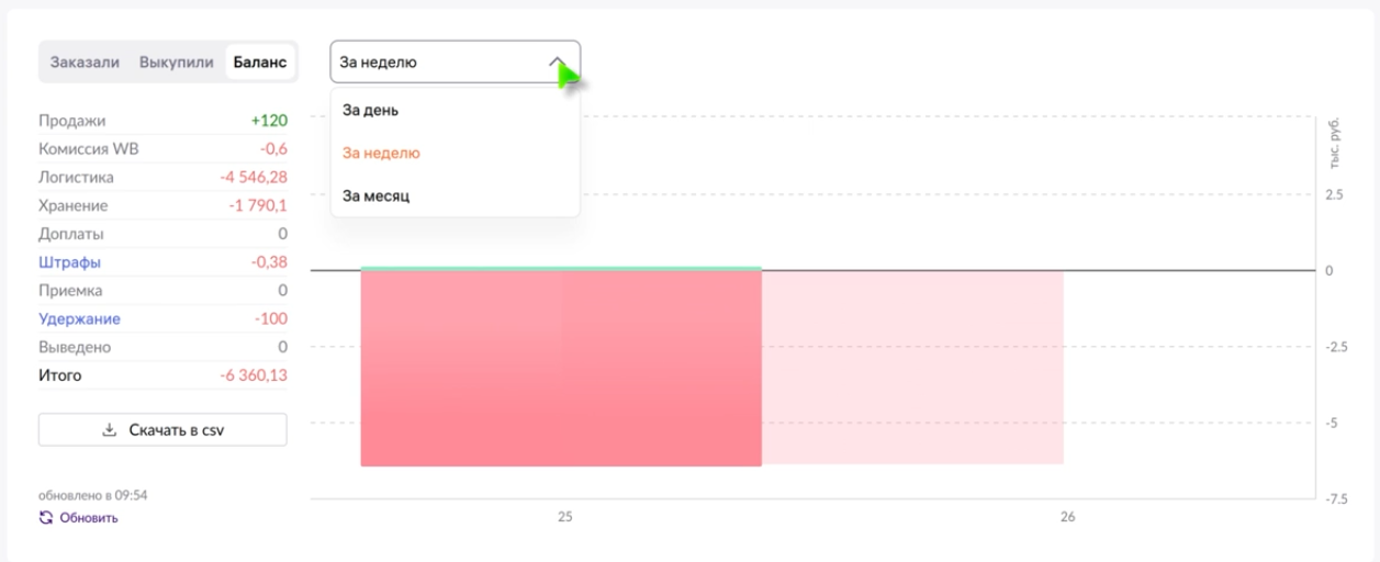 В правой части экрана находится виджет детализации баланса с графиками для отслеживания продаж и контроля затрат на логистику. В настройках можно выгрузить данные по заказам, выкупленным товарам и балансу за день или за 1-4 недели.