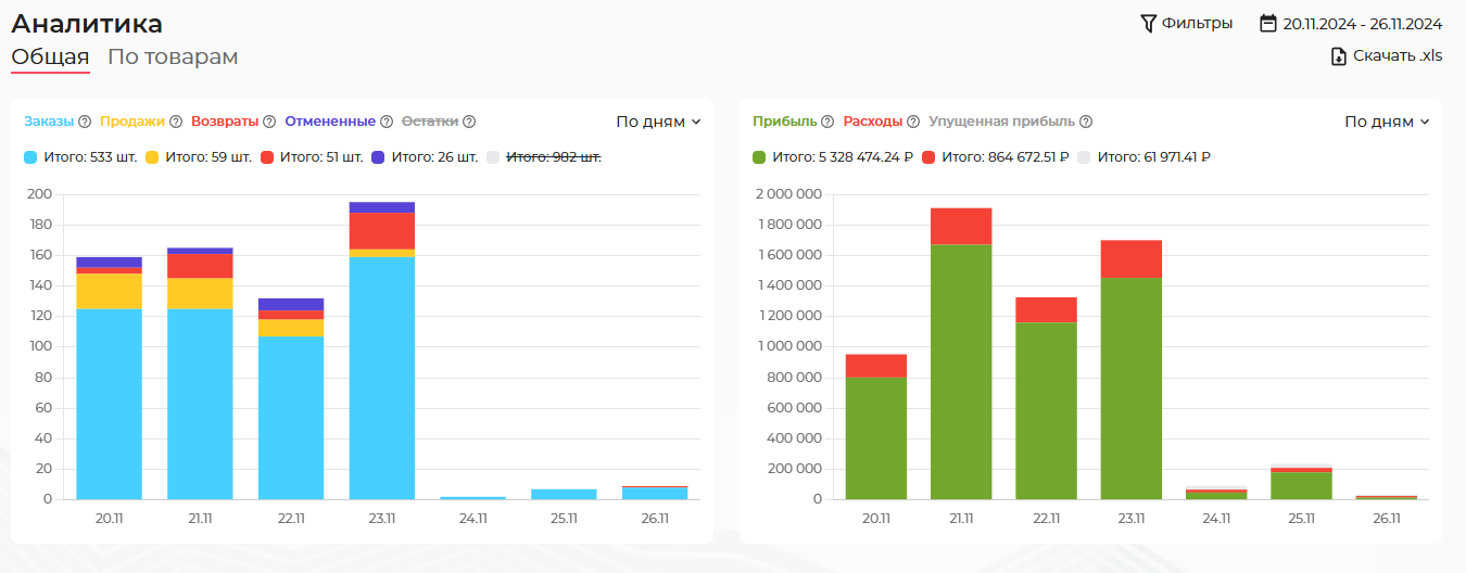 Отчет по общей аналитике на Wildberries, Ozon, Yandex Market и других площадках нужен для оценки баланса расходов и прибыли за выбранный период. Выбираем в меню раздел Аналитика, вкладка Общая.