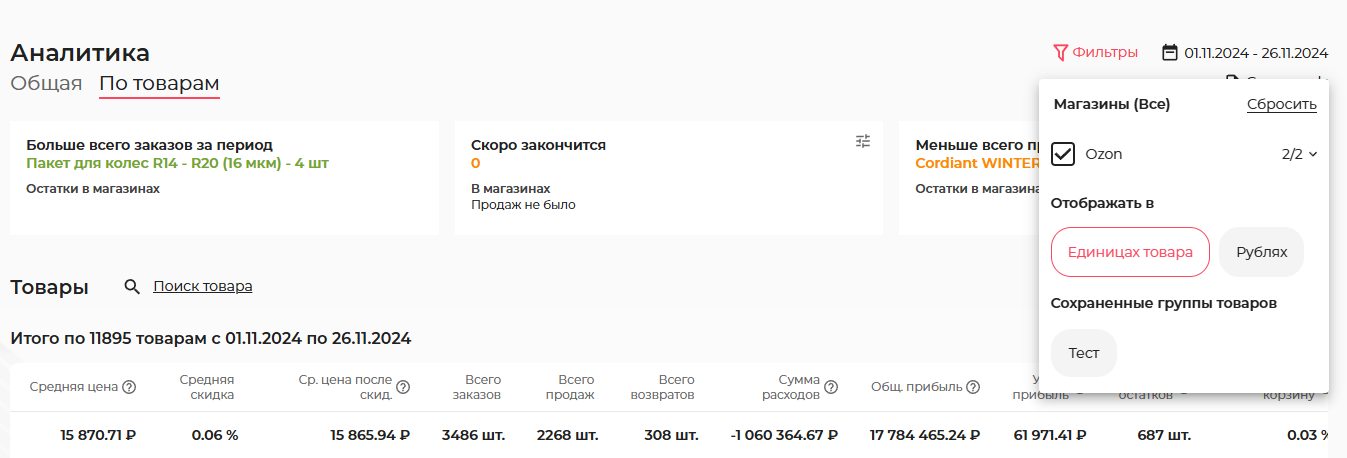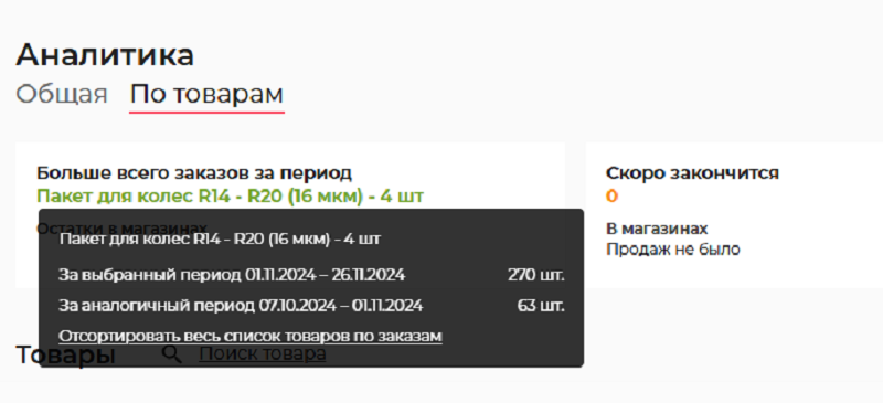 Успешный селлер постоянно мониторит уровень спроса на продукцию, выявляет позиции без движения, усиливает позиции среднего звена и обеспечивает регулярные поставки товаров-локомотивов. Принимать правильные решения помогает аналитика по товарам. Отчет за выбранный период показывает: