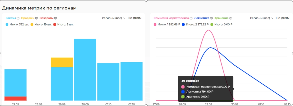 В сервисе доступен просмотр динамики метрик по регионам за выбранный период, например, за неделю.