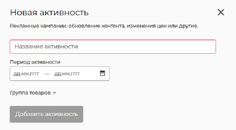 При заполнении данных Активности привязываем группу продукции, на которую рассчитана та или иная рекламная кампания.