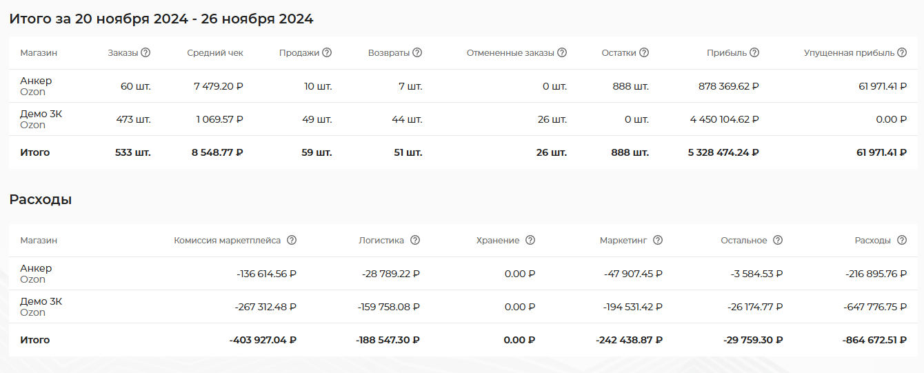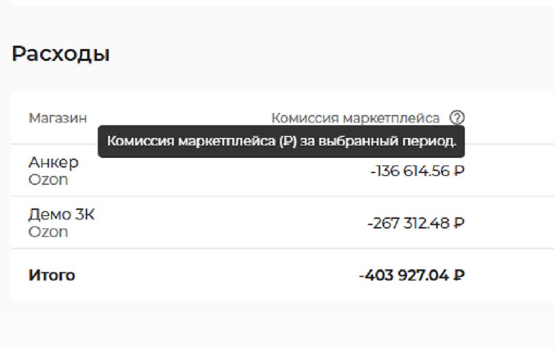 сколько денег ушло на комиссию маркетплейса, логистику, хранение, маркетинг и прочие расходы постатейно и в сумме.