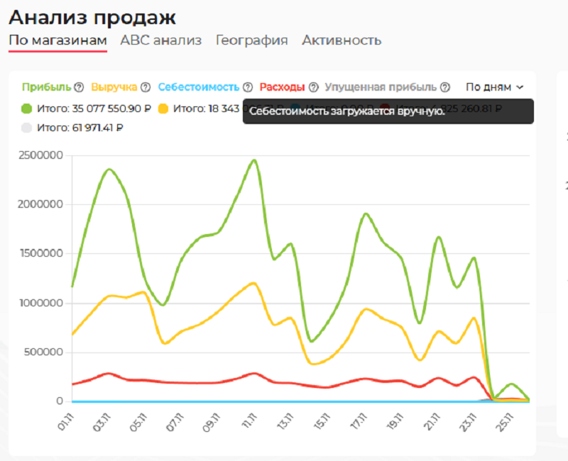 Чтобы посмотреть аналитику по магазинам, не нужно загружать кучу отчетов. Заходим в соответствующую вкладку Аналитики, выбираем период, получаем желаемое.