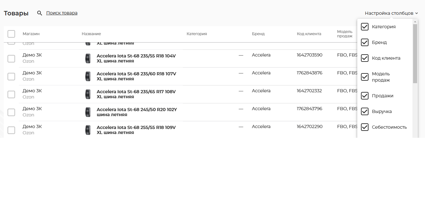 Себестоимость продукции является ключевым показателем статистики для расчета окупаемости в продажах на Вайлдберриз, Яндекс маркете, Озоне и других маркетплейсах. Для изменения себестоимости заходим в Аналитику по магазинам. Для настройки столбцов в описании продукта есть выпадающий список.