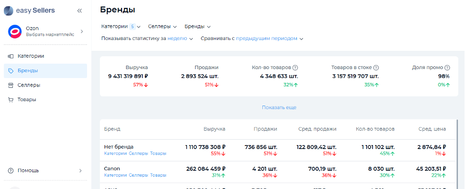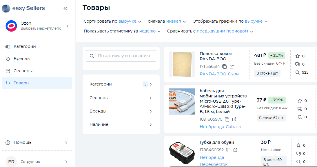 В кабинете EasySellers Tool можно отслеживать метрики по категориям, селлерам, брендам и товарам. Перед выгрузкой данных необходимо определить временной период. С помощью опции сравнения данных с другим/предыдущим периодом удобно мониторить эффективность продаж, сезонный спрос и отслеживать тренды рынка. В аналитике по товарам можно увидеть цену со скидкой и без, складские остатки по данной позиции, перейти в карточку товара на маркетплейсе для более детального изучения конкурента. EasySellers Tool — мультифункциональный сервис внешней аналитики для новичков и опытных селлеров.