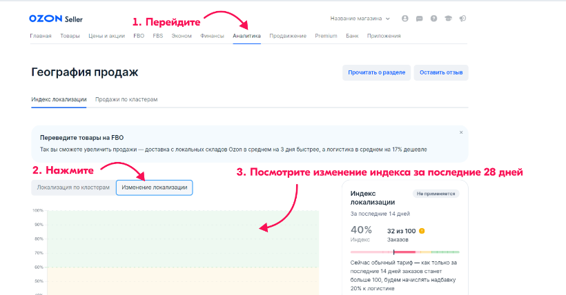 Вопрос, интересующий продавцов, — где посмотреть индекс локализации. Проверить ИЛ и узнать о скидке на логистику можно, изучив специальный виджет на главной странице сайта и в приложении Ozon Seller, а также в разделах «Заявки на поставку» по схеме FBO и «География продаж» в общей аналитике.