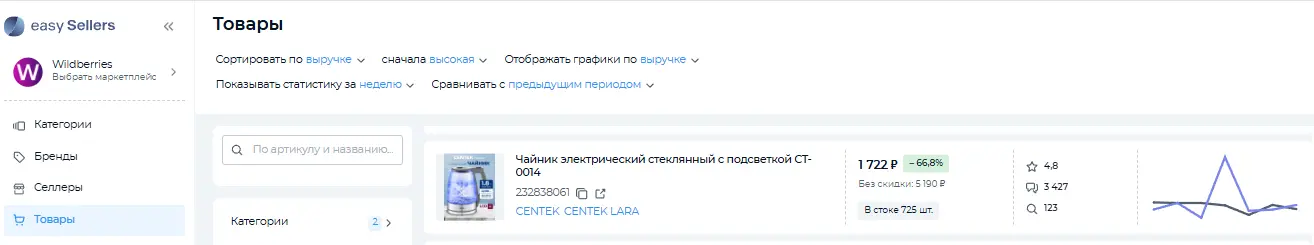 Выгрузим статистику по данному товару у селлера CENTEC в Easy-sellers Tool. Благодаря возможностям сервиса получаем следующие сведения:
