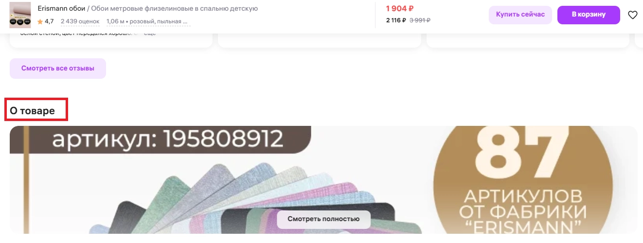 В десктопной версии маркетплейса rich-контент располагается под блоком с отзывами. В мобильной версии блок «богатого» контента находится ниже блока с датой и условиями доставки, а также чуть ниже отзывов.