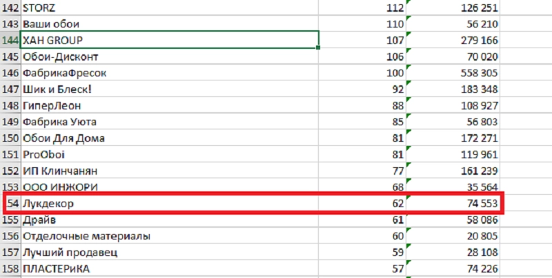 Рич-контент для товаров на Вайлдберриз — эффективный инструмент для повышения продаж. Однако работа над маркетинговым контентом — это лишь часть пути селлера к успеху. К примеру, продавец обоев «Лукдекор» из нашего примера занимает только 154 позицию с выручкой в 74 553 рубля. Отчетность составлена телеграм-ботом CAT Lite Bot и содержит данные о продажах в категории по селлерам за месяц.