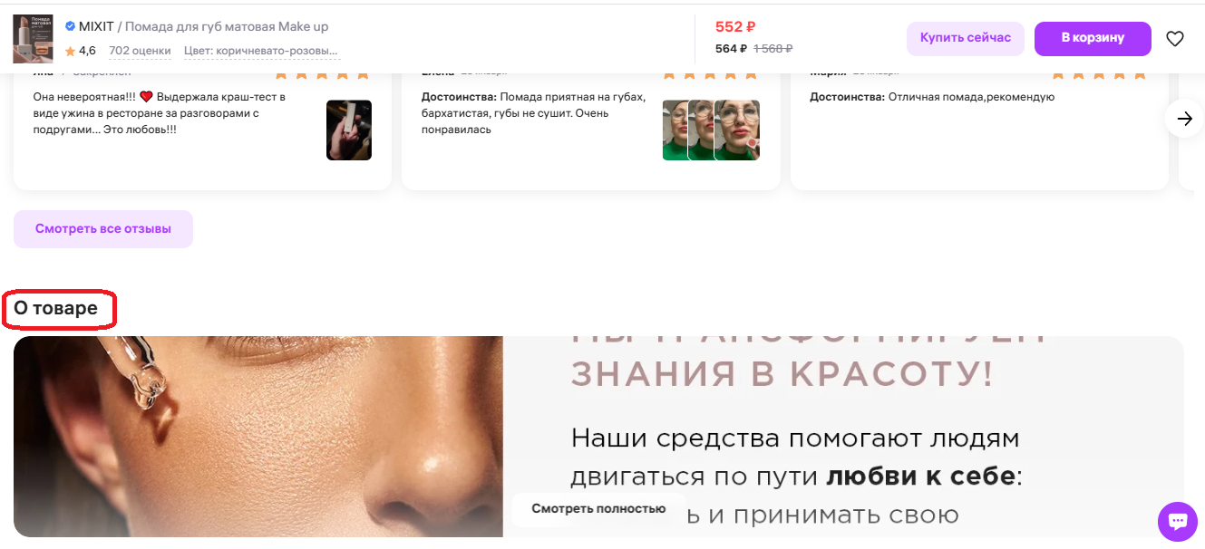 На Вайлдберриз rich-content располагается под блоком с отзывами. Первый экран лендинга, фото или стартовый кадр видеоряда привлекает к себе внимание: покупателя приглашают узнать больше и открыть контент с рекламным предложением.