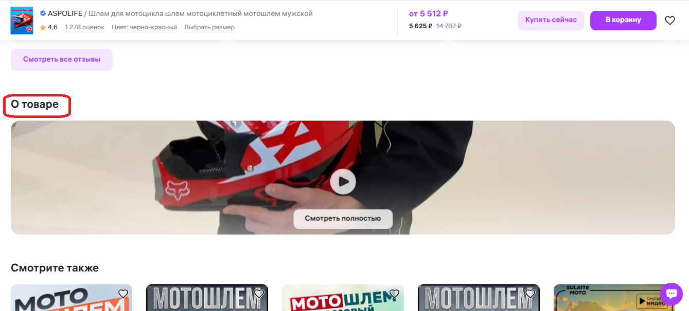 В роликах рич контента работают все типы рекламных видеоматериалов: видеообзоры, проходка, motion-видео. Иногда продавцы снимают общий ролик для целой коллекции и размещают его в рекламном блоке каждой карточки из подборки. Это экономично и эффективно: клиент видит не только интересующую его модель, но и другие релевантные предложения селлера.