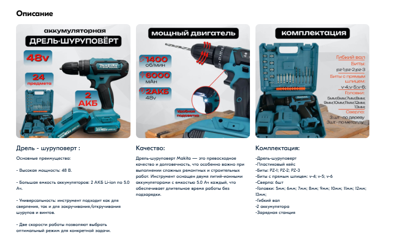 Преимущества. Акценты на плюсах изделия (модная цветовая гамма, оригинальное исполнение, наличие дополнительных аксессуаров). Детализация в описании способствуют росту KPI позиции.