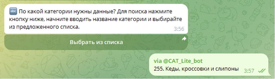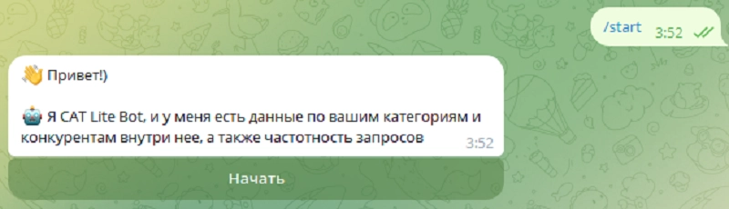 Недостающие данные внешней аналитики рынка по категории можно получить в бесплатном телеграм-боте CAT Lite Bot. Чтобы начать, перейдите по ссылке https://t.me/CAT_Lite_bot, дайте разрешение на обработку персональных данных и отправьте номер телефона.