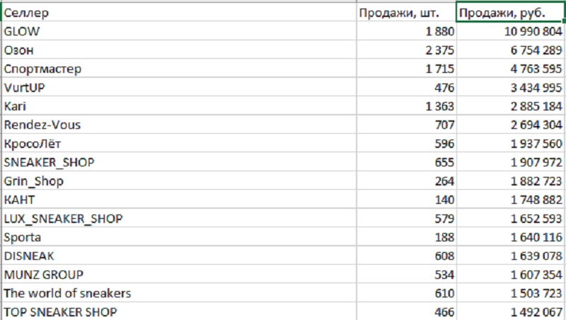 В таблице три колонки: селлер, количество проданных пар обуви, сумма продаж за месяц.