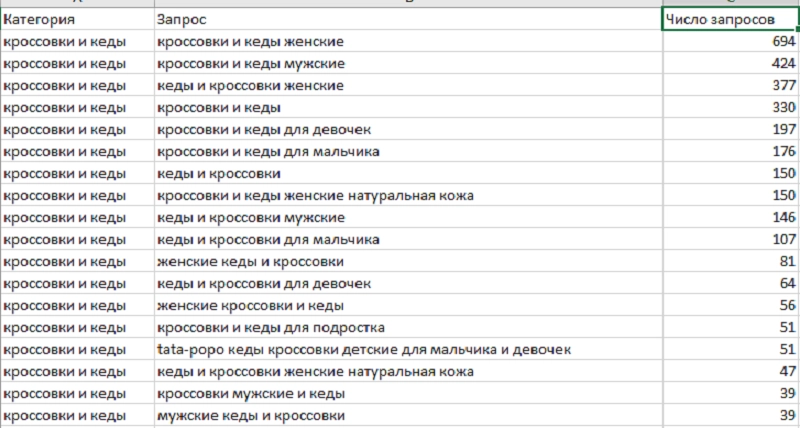 Эта информация поможет оценить популярность категории, увидеть потенциальных конкурентов и принять решение о том, стоит ли продавать мужские кроссовки и слипоны.