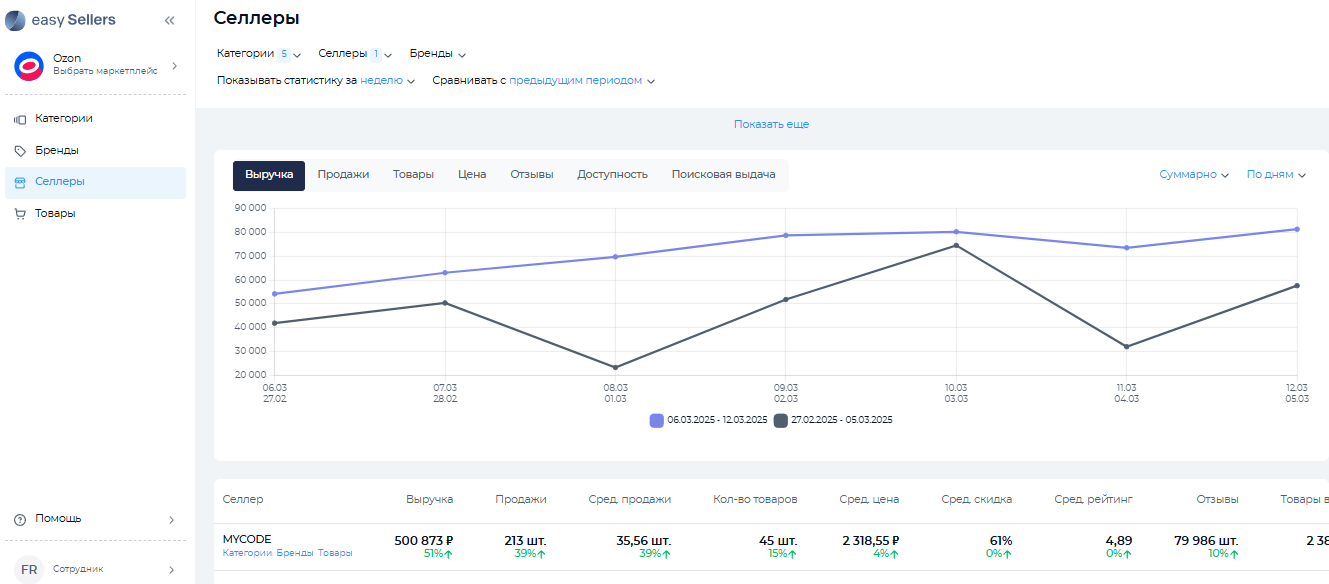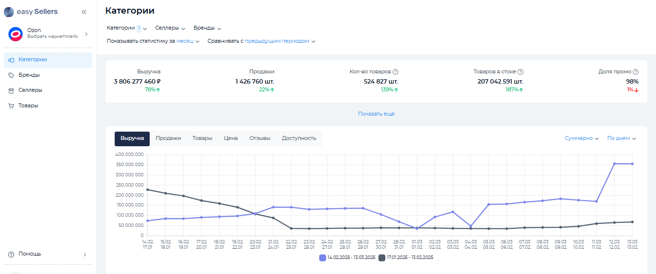 Выявить лидеров рынка и найти популярные товары с качественным контентом в нише поможет EasySellers Tool. Этот цифровой сервис открывает неограниченные возможности для мониторинга продаж и складских остатков конкурентов, отслеживания трендов, оценки спроса в сегменте и других аналитических операций. EasySellers Tool — источник информации о брендах, продавцах и товарах на разных маркетплейсах, который всегда под рукой.