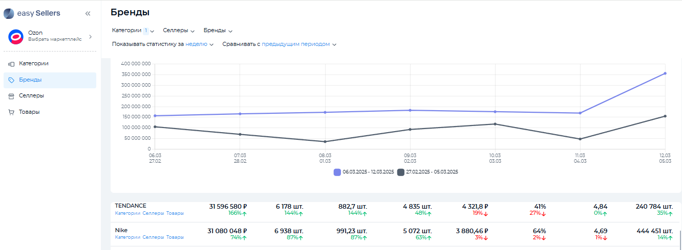 Прежде чем создавать собственный контент для маркетплейсов, изучите лучшие товары конкурентов. Для выявления основных соперников удобно использовать возможности Easy-sellers tool. Возьмем в качестве примера категорию «Обувь» на Озоне и выгрузим данные топовых брендов.