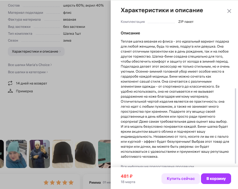 Чтобы понять, как TENDance привлекает и удерживает целевую аудиторию, проведем оценку качества контента в карточке товара.